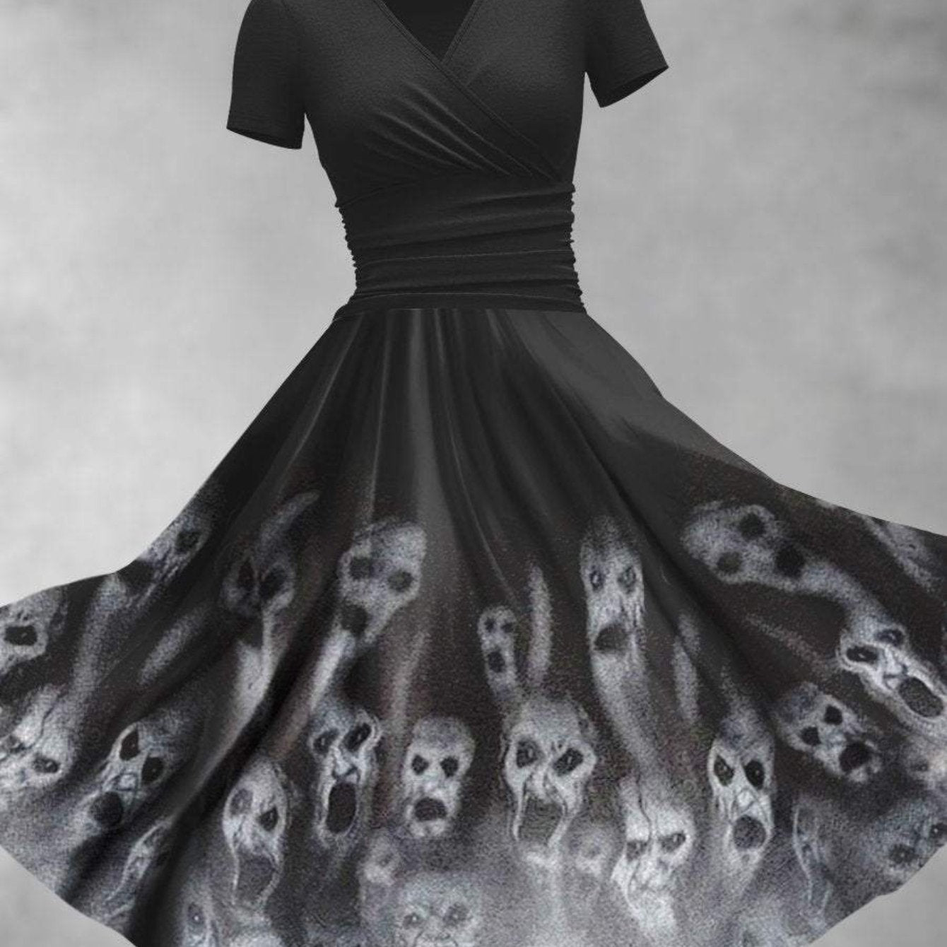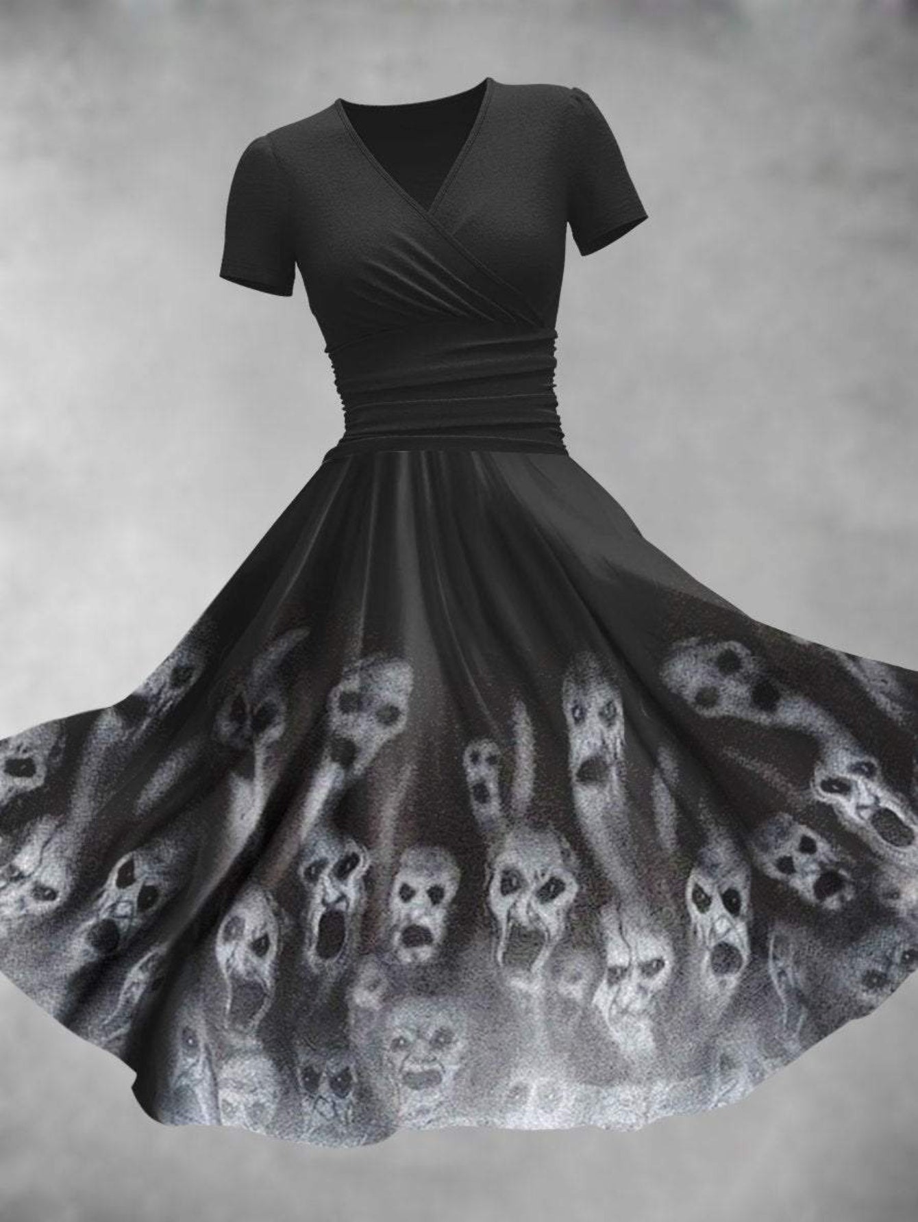 Plus Size, Women's Halloween Party Dress - V-Neck Long flared skirt, Black & Gray Gothic Print, Machine Washable Formal & Everyday Outfits for Halloween Events & Casual Attire