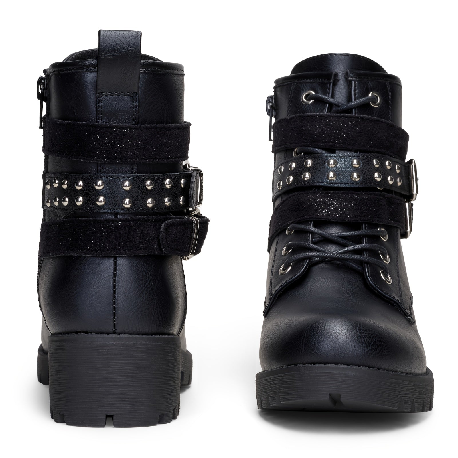 These stylish moto boots have adjustable straps and on the other side of the shoe zipper also works.